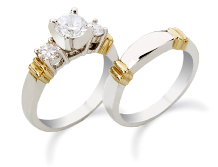 White and yellow gold engagement ring featuring a round center diamond, side diamonds and matching wedding band.