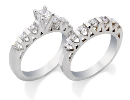White gold engagement ring featuring a round center diamond and side diamonds. Accompanied by a matching wedding band.