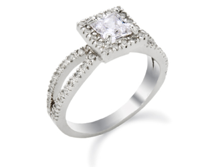 White gold engagement ring featuring a princess cut center diamond and round melee.