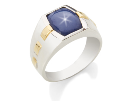 White and yellow gold synthetic blue star sapphire men's ring