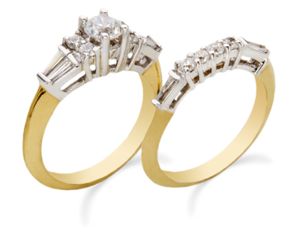 White and yellow gold engagement ring featuring a round center diamond with round and tappered baguette side diamonds.